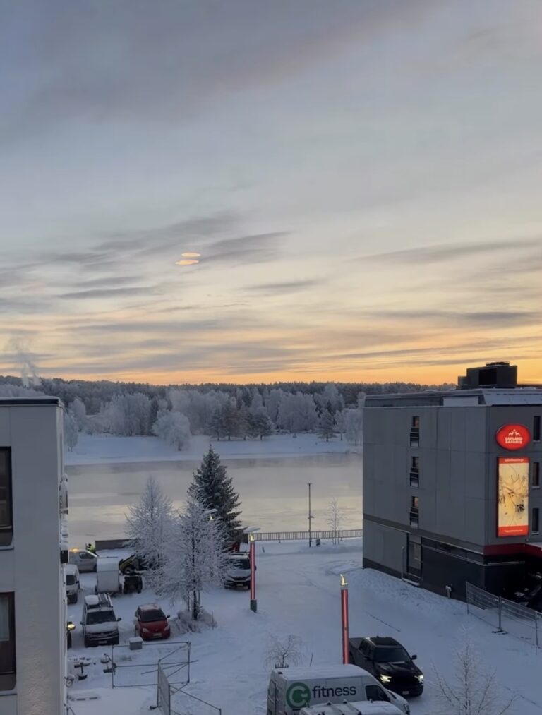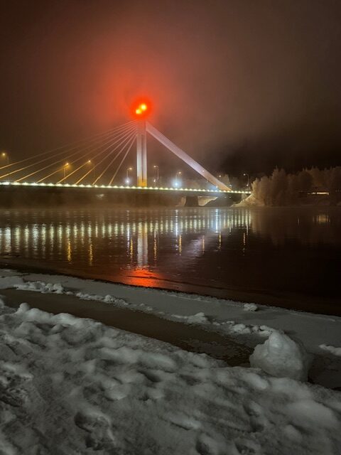 Ein weiteres Highlight war der Ausblick. Wir konnten sogar ein Stück auf den großen Fluss von Rovaniemi schauen, inklusive Blick auf die bekannte Brücke, die das Stadtbild prägt. Abends war das besonders stimmungsvoll. Geschlafen haben wir übrigens sehr gut, ruhig, gemütlich und erholsam.